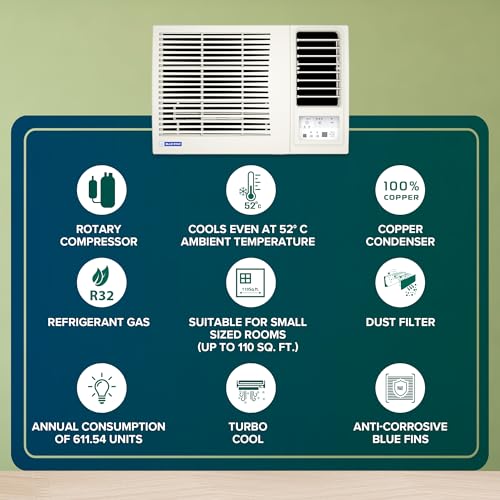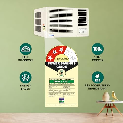About this item Copper Condenser: Blue Star Window ACs offer unsurpassed cooling thanks to its highly efficient rotary compressor and are fully loaded with features such as sleep mode and anti freeze thermostat. Capacity: 0.8 Ton Suitable for small sized rooms (up to 100 sq.ft) Energy Rating: 3 Star. Annual Energy Consumption: 648.7 units. ISEER Value: 3.15 . The star rating is as per new BEE guidelines effective from 1st July 2022. (Rated) Voltage/Frequency/Phase: 230 V / 50Hz / Single, Cooling Rated Power Input- 790 Watt. Manufacturer Warranty : 80 Months Warranty on Compressor by Blue Star Comfort Sleep, Modes – (Auto/Cool/ Fan/ Dry), Turbo Cooling, 2D Swing, Air Flow Direction Control