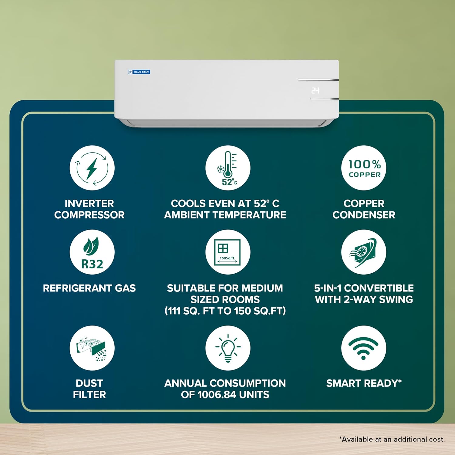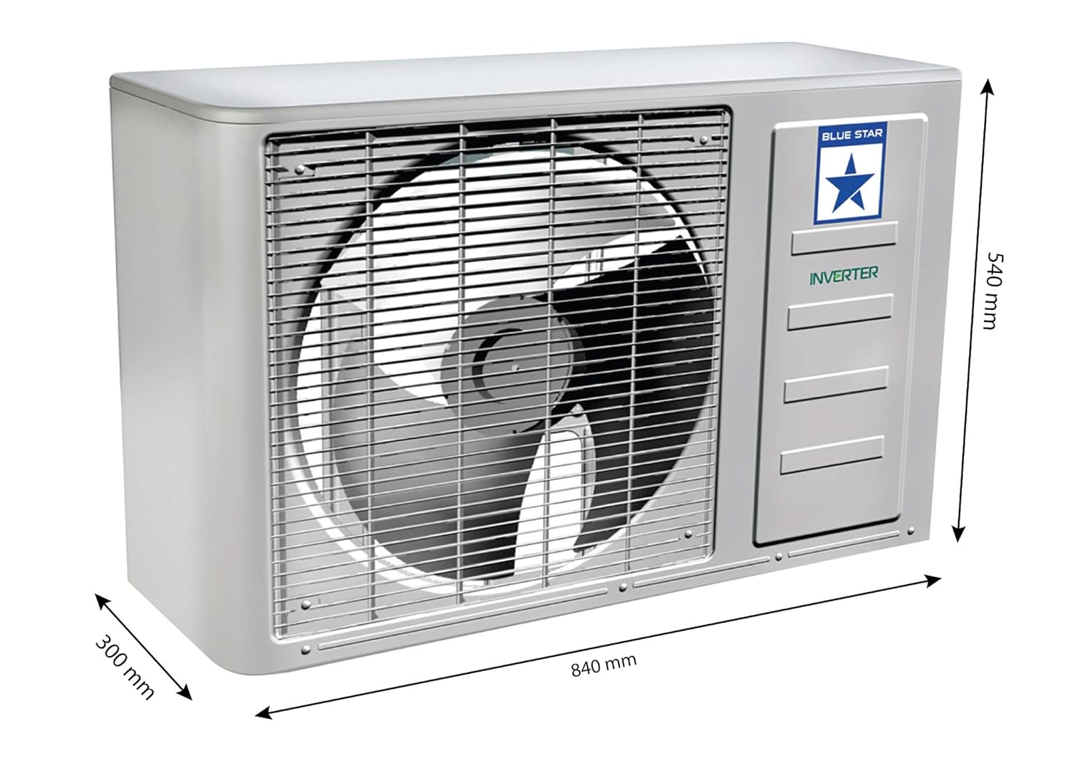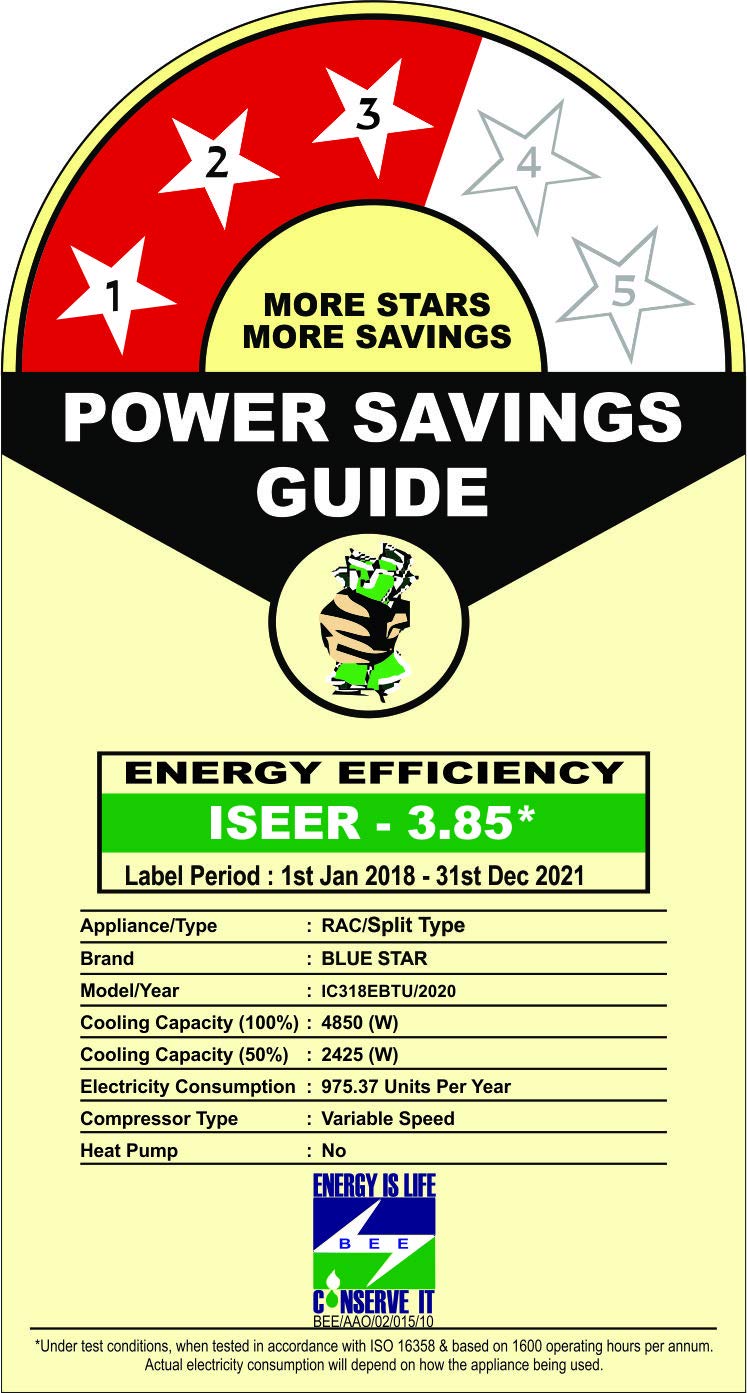 About this item Split AC with inverter compressor: 5-in-1 Convertible Cooling: Unique 5-in-1 cooling mode to run your AC at 5 different capacities as per the desired comfort. It comes in combination of 2 buttons in the remote. Blue Star AC’s condenser coil, evaporator coil, and connecting tubes are made of 100% copper, thereby ensuring reliable cooling performance and enhanced durability. Capacity: 1.5 Ton Suitable for medium sized rooms (151 to 180 sq ft.); Air Circulation (High / Medium / Low): 471/401/318/251 CFM, Cooling Capacity (Min~Max) : 5010(1767~5150) W & Ambient Temperature: 21 degree to 52 degree Celsius with 2 way air swing Energy Rating: 3 Star. Annual Energy Consumption: 544.39 units. ISEER Value: 3.9 | The star rating is as per new BEE guidelines. Noise Level: 42.4(db); Ambient Temperature: 52 degree Celsius Manufacturer Warranty: 5 Years on Product, 10 Years on Inverter Compressor(T&C*).Covers-comprehensively all repairs, rectification or replacement of Components like Electronic PCB, IDU Evaporating Coil & ODU Condenser Coil. Excludes all types of air filters, plastic and metal parts, remote handset & gas charging.Gas charging associated with Compressor/Evaporator/Condenser coil to be paid by customer. Warranty applies to residential usage only. Smart Ready: The AC is ready to be operated* using Blue Star’s Smart App and through Voice Command using Amazon Alexa or Google Home *To operate through Smart App or Voice Command, user has to pay an additional charge to convert the AC into Smart AC completely. Energy Saver: The Eco mode helps save on your electricity bills, while giving you comfortable cooling experience. Turbo Cool: Pre-set mode to instantly cool the room during extreme summers. Key Features: 100% Copper, Acoustic Insulation Compressor Jacket, Anti-Corrosive Blue Fins for Protection, Comfort Sleep, Dry Mode, Eco Mode, Hidden Display, Inverter Technology, Self Diagnosis, Turbo Cool