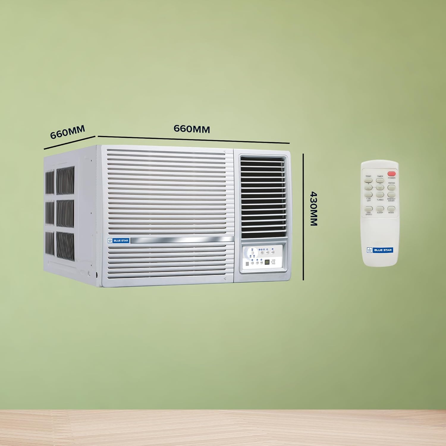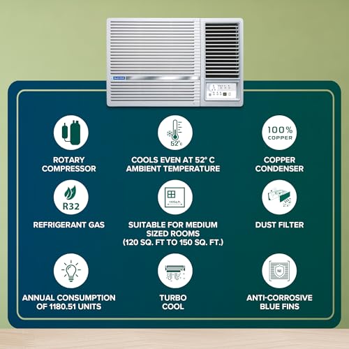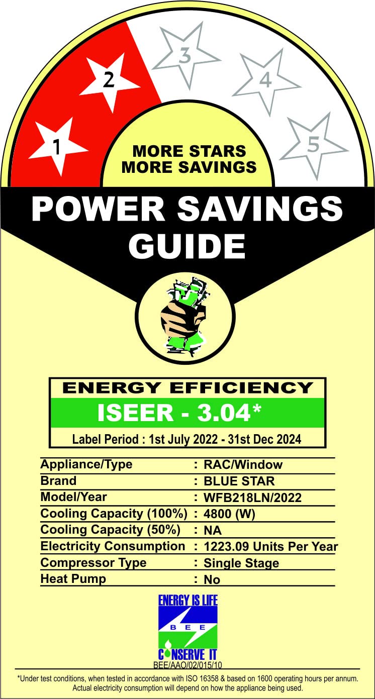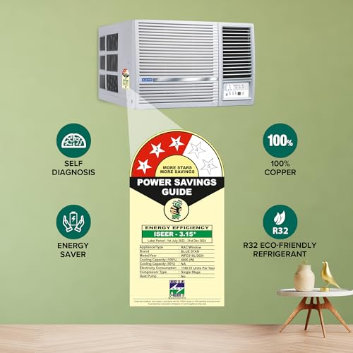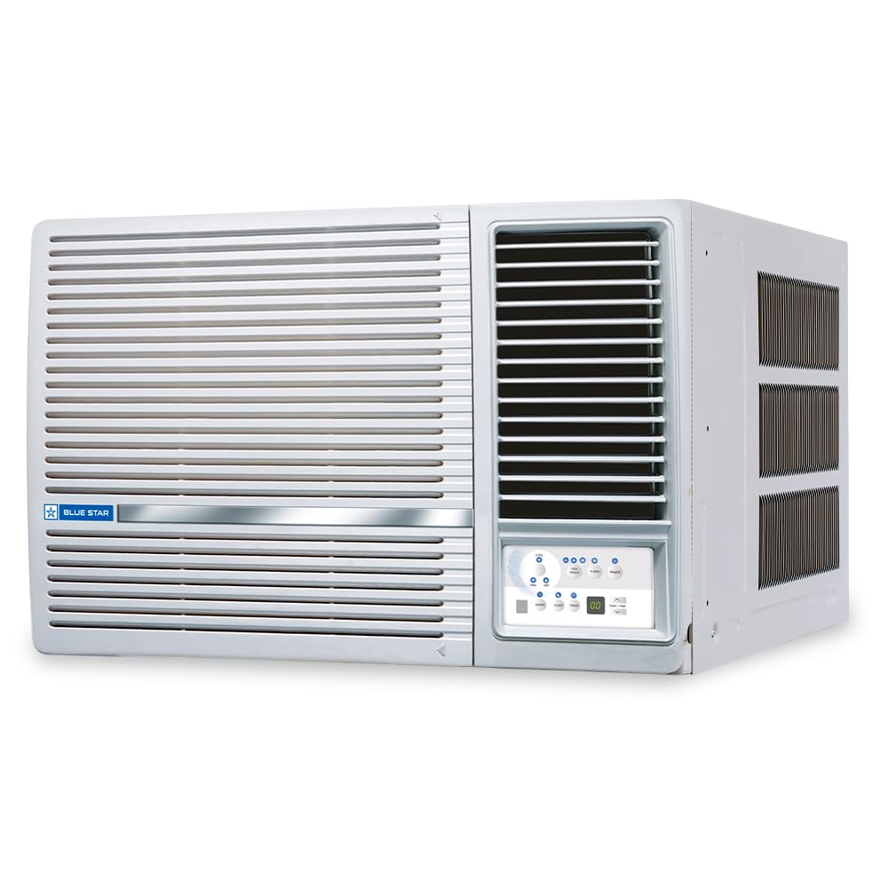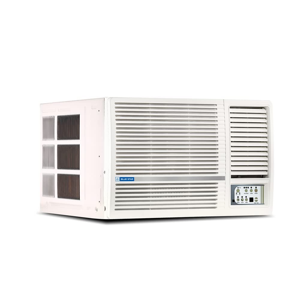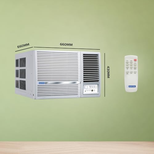 About this item Copper Condenser: Blue Star Window ACs offer unsurpassed cooling thanks to its highly efficient rotary compressor and are fully loaded with features such as sleep mode and anti freeze thermostat. Capacity: 1.5 Ton Suitable for medium sized rooms (111 to 150 sq.ft) Energy Rating: 3 Star. Annual Energy Consumption: 1168.9 units. ISEER Value: 3.15. The star rating is as per new BEE guidelines effective from 1st July 2022. (Rated) Voltage/Frequency/Phase: 230 V / 50Hz / Single, Cooling Rated Power Input- 1525 Watt. Manufacturer Warranty : 80 Months Warranty on Compressor by Blue Star Comfort Sleep, Modes – (Auto/Cool/ Fan/ Dry), Turbo Cooling, 2D Swing, Air Flow Direction Control Key Features: Noise Level: 56(db); Ambient Temperature: 52 degree Celsius Special Features: Evaporator Fins-Hydrophilic Blue, High Energy Efficient Rotary Compressor, Energy Saver, Turbo Cool, Humidity Control (Dry Mode), 2D Swing, Night Glow Remote Buttons
