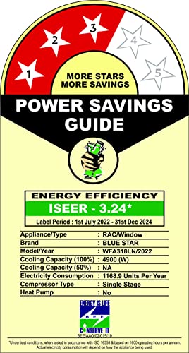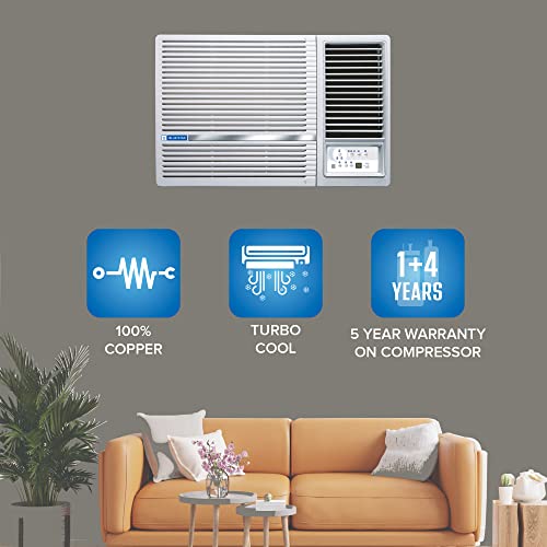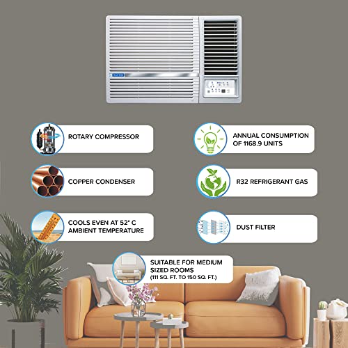 About this item Copper Condenser: Blue Star Window ACs offer unsurpassed cooling thanks to its highly efficient rotary compressor and are fully loaded with features such as sleep mode and anti freeze thermostat. Capacity: 1.5 Ton Suitable for medium sized rooms (111 to 150 sq.ft) Energy Rating: 3 Star. Annual Energy Consumption: 1168.9 units. ISEER Value: 3.24 | The star rating is as per new BEE guidelines effective from 1st July 2022. (Rated) Voltage/Frequency/Phase: 230 V / 50Hz / Single Manufacturer Warranty : 5 Year Warranty on Fixed Speed Compressor by Blue Star Comfort Sleep, Modes – (Auto/Cool/ Fan / Dry), Turbo Cooling, Air Flow Direction Control, Auto Restart With Memory Function, Fan Modes – Auto/High/Medium/Low Key Features: Noise Level: 53(db); Ambient Temperature: 52 degree Celsius, Dust Filters, Eco Mode, Led Display In IDU, Self Diagnosis, Timer Off, Timer On, Multi Sensors, Stabiliser Free Operation Special Features: Evaporator Fins-Hydrophilic Blue, High Energy Efficient Rotary Compressor, Energy Saver, Turbo Cool, Humidity Control (Dry Mode), 2D Swing, Night Glow Remote Buttons