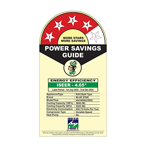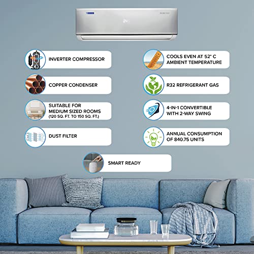 About this item Split AC with inverter compressor: Variable speed compressor which adjusts power depending on heat load. Capacity: 1.5 Ton Suitable for medium sized rooms (111 to 150 sq.ft) Energy Rating: 4 Star. Annual Energy Consumption: 850.74 units. ISEER Value: 4.6 | The star rating is as per new BEE guidelines Manufacturer Warranty: 5 Years on Product, 10 Years on Inverter Compressor(T&C*).Covers-comprehensively all repairs, rectification or replacement of Components like Electronic PCB, IDU Evaporating Coil & ODU Condenser Coil. Excludes all types of air filters, plastic and metal parts, remote handset & gas charging.Gas charging associated with Compressor/Evaporator/Condenser coil to be paid by customer. This applies to residential usage only. Copper Condenser Coil: Better cooling and requires low maintenance Key Features: Noise Level: 37.2(db); Ambient Temperature: 52 degree Celsius Special Features: 4 in 1 Convertible Cooling Mode,Turbo Cool, Comfort Sleep,Self Diagnosis, Dust Filter