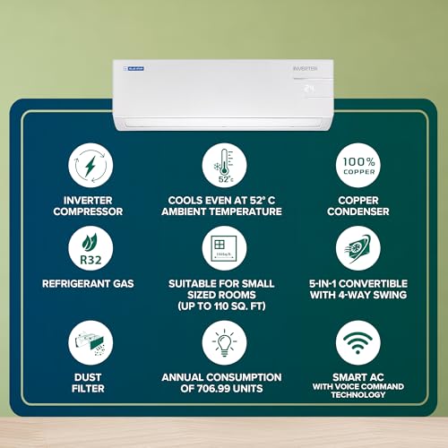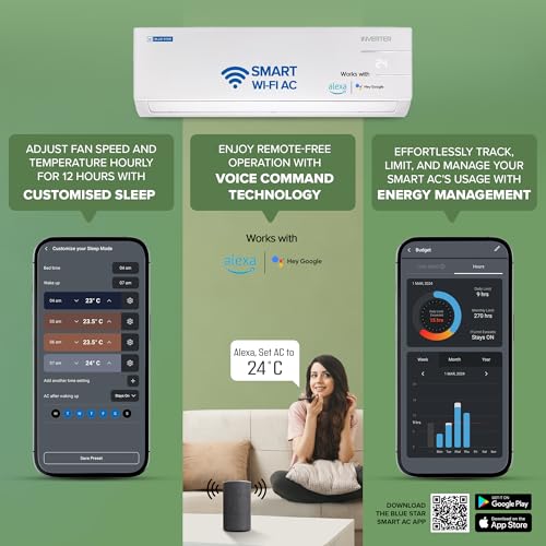 About this item Split AC with inverter compressor: Smart AC with Smart App: Your Blue Star Smart AC comes with an in-built Wifi module which ensures that you can use your AC from anytime, anywhere, truly the smart way. Voice Command Technology: Operate your AC with Voice Command using Amazon Alexa or Google Assistant. Switch On, set the temperature and enjoy comfort cooling through Voice Command Assistants. Capacity: 1 Ton – Suitable for small sized rooms (< = 120 sq ft). Energy Star Rating: 3 Star | Annual Power Consumption: 706.99 kWh | ISEER: 3.85. The star rating is as per new BEE guidelines. 390 CFM Air Circulation & Ambient Temperature: 21 to 52 degree Celsius. Manufacturer Warranty: 5 Years on Product, 10 Years on Inverter Compressor(T&C*).Covers-comprehensively all repairs, rectification or replacement of Components like Electronic PCB, IDU Evaporating Coil & ODU Condenser Coil. Excludes all types of air filters, plastic and metal parts, remote handset & gas charging.Gas charging associated with Compressor/Evaporator/Condenser coil to be paid by customer. This applies to residential usage only. 5-in-1 Convertible: Unique 5-in-1 cooling mode to run your AC at 5 different capacities as per the desired comfort. It comes in combination of 2 buttons in the remote. Special feature: Wifi Enabled: Set your room temperature from anywhere using your Smart Phone. Blue Star’s Wifi Enabled Smart App provides the convenience to enable you to set the desired temperature and smart manage your AC usage throughout the year. Key Features: 100% Copper, Anti-Corrosive Blue Fins for Protection, Comfort Sleep, Dry Mode, Eco Mode, Hidden Display, Inverter Technology, Self Diagnosis, Turbo Cool Energy Saver: The Eco mode helps save on your electricity bills, while giving you comfortable cooling experience. Comfort Sleep: Intelligently adjusts the AC’s operation providing the right cooling comfort and ensuring comfortable sleep.