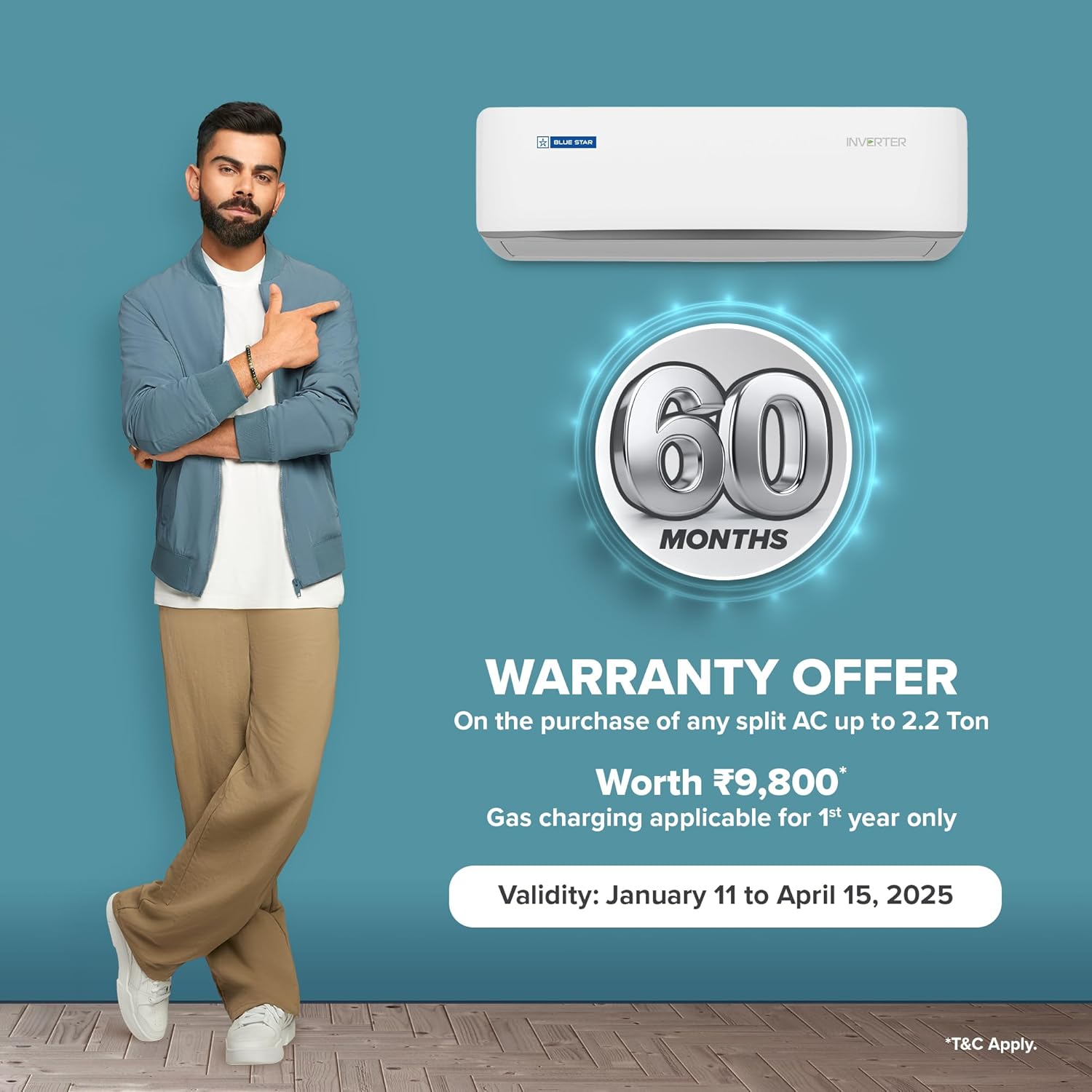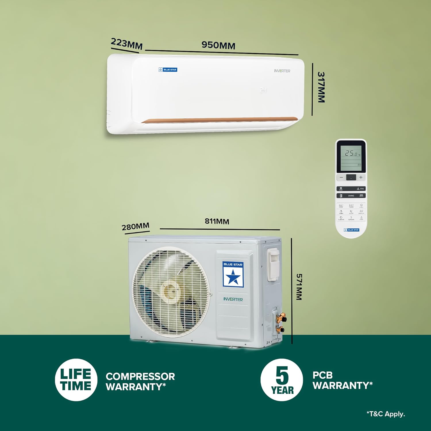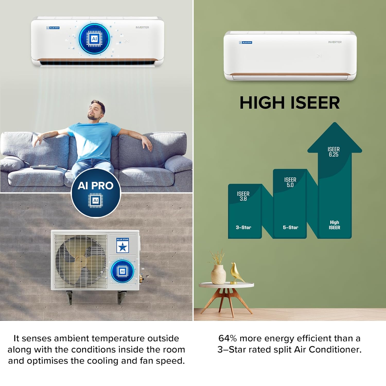 About this item Split AC with inverter compressor:Smart AC with Smart App, Your Blue Star Smart AC comes with an in-built Wifi module which ensures that you can use your AC from anytime, anywhere, truly the smart way. Capacity: 1 Ton – Suitable for small-medium sized rooms (110 sq ft). Energy Star Rating: 5 Star | Annual Power Consumption: 538.94 kWh | ISEER: 5.05. The star rating is as per new BEE guidelines. Ambient Temperature: 52 degree Celsius Energy Rating: 5 Star. annual energy consumption 770.98 Kilowatt Hours Per Year. AI Pro senses the ambient temperature outside and the conditions inside the room. It then intelligently adjusts & optimises the cooling and fan speed to ensure maximum comfort. Manufacturer Warranty: 5 Years on Product, 10 Years on Inverter Compressor(T&C*).Covers-comprehensively all repairs, rectification or replacement of Components like Electronic PCB, IDU Evaporating Coil & ODU Condenser Coil. Excludes all types of air filters, plastic and metal parts, remote handset & gas charging.Gas charging associated with Compressor/Evaporator/Condenser coil to be paid by customer. This applies to residential usage only. Key features: 100% Copper, Acoustic Insulation Compressor Jacket, Anti-Corrosive Blue Fins for Protection, Comfort Sleep, Dry Mode, Eco Mode, Hidden Display, Inverter Technology, Self Diagnosis, Turbo Cool Hexa Inverter Technology: This technology features a robustly designed compressor which provides enhanced performance even at high ambient conditions, delivers effective energy savings and enhanced comfort for the user. Special feature: DigiQ Hepta Sensors, Blue Star’s ACs are designed with 7 intelligent digital sensors that with its advanced microcontroller offer precise cooling even in extreme summer, optimise cooling in load variation and protect critical electronic components whilst in operation.