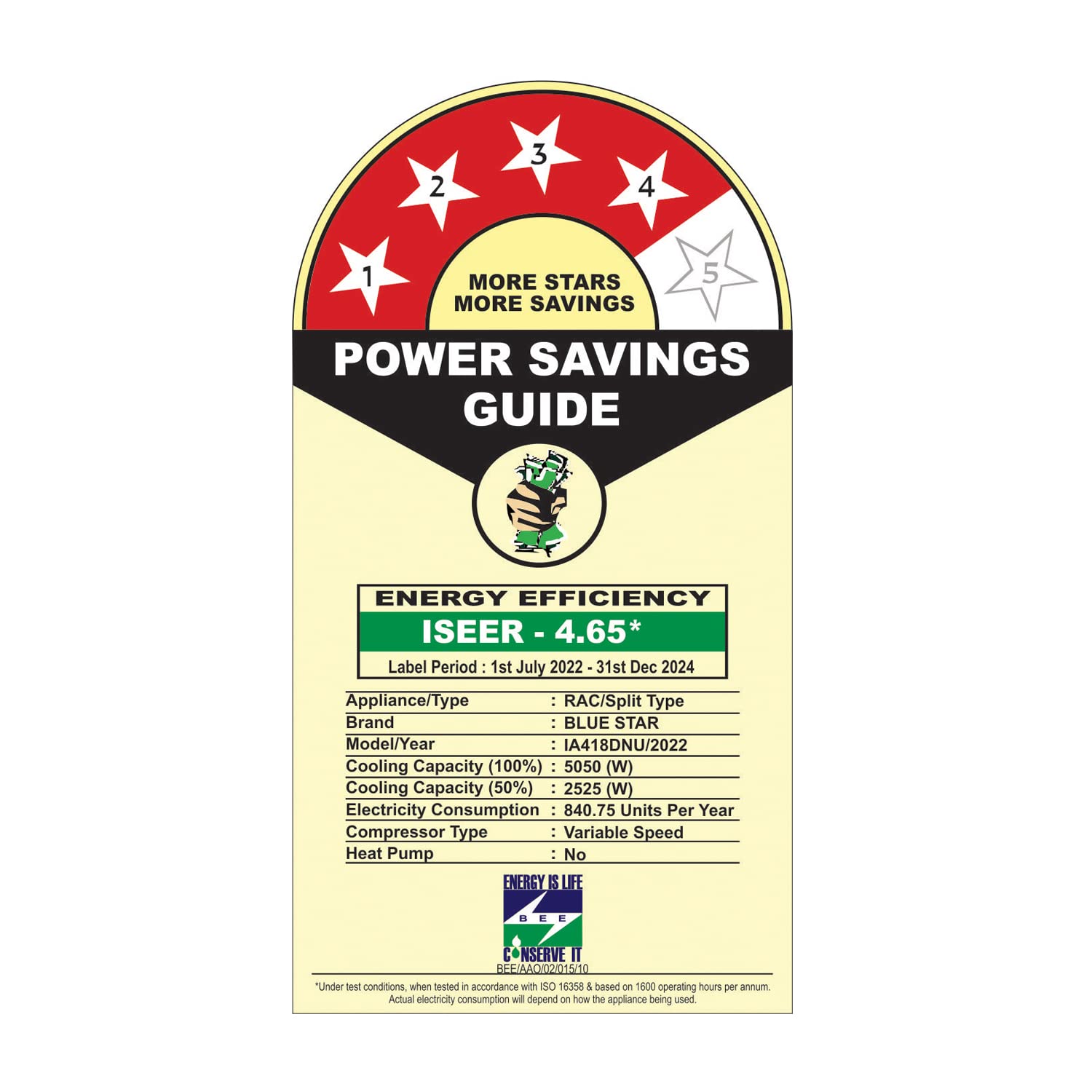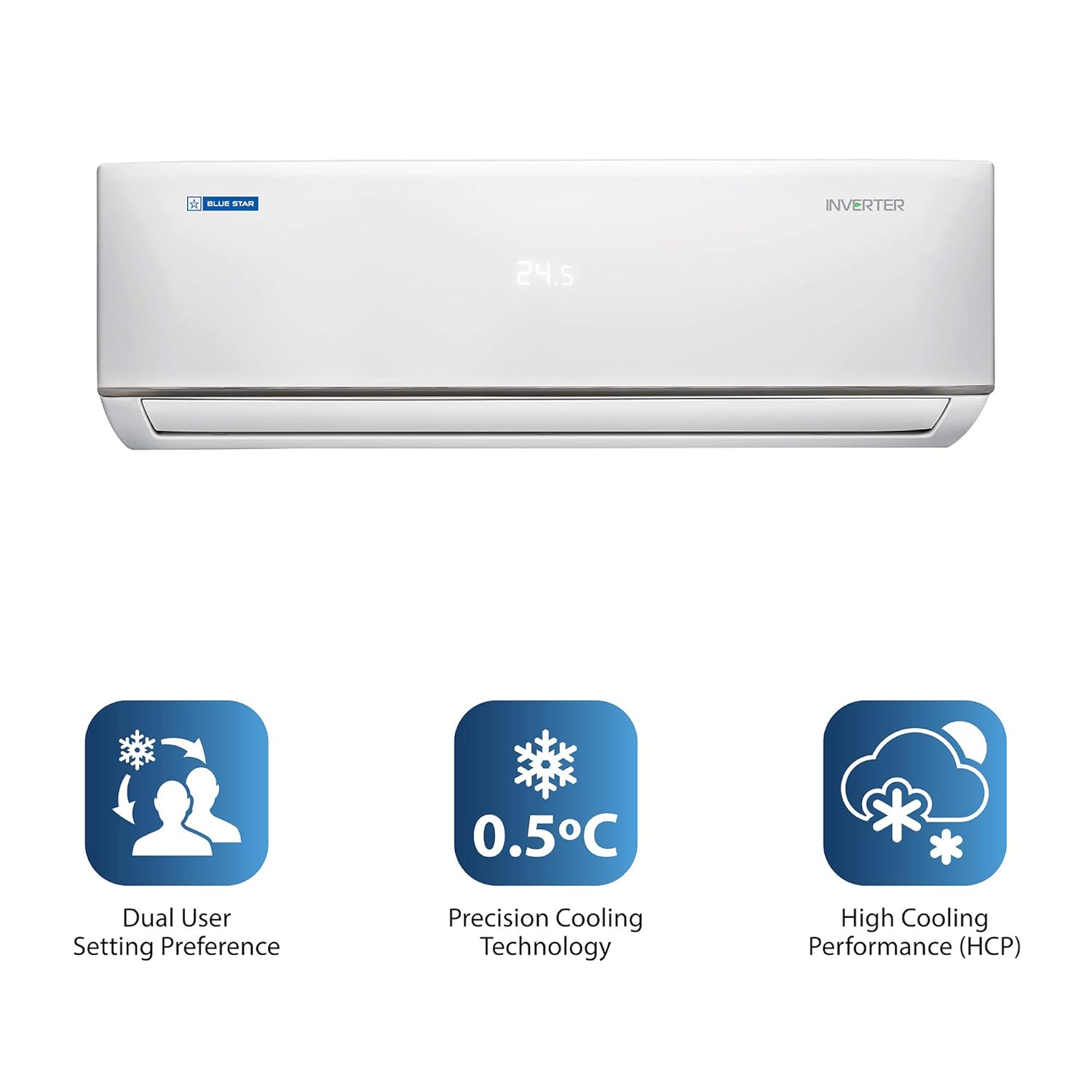 About this item 5-in-1 Convertible Cooling: Unique 5-in-1 cooling mode to run your AC at 5 different capacities as per the desired comfort. It comes in combination of 2 buttons in the remote. Capacity: 2 Ton Suitable for medium sized rooms (151 to 200 sq.ft); Air Circulation (High / Medium / Low): 576/501/399 CFM, Cooling Capacity (Min~Max) : 6350 (1772~6624) W & Ambient Temperature:52 degree Celsius with 2D Way Air Swing Energy Rating : 3 Star | Annual Energy Consumption: 1261.37 Units Per Year| ISEER Value: 3.90 (The star rating is as per new BEE guidelines) Manufacturer Warranty: 5 Years on Product, 10 Years on Inverter Compressor(T&C*).Covers-comprehensively all repairs, rectification or replacement of Components like Electronic PCB, IDU Evaporating Coil & ODU Condenser Coil. Excludes all types of air filters, plastic and metal parts, remote handset & gas charging.Gas charging associated with Compressor/Evaporator/Condenser coil to be paid by customer. This applies to residential usage only. 100% Copper: Blue Star AC’s condenser coil, evaporator coil, and connecting tubes are made of 100% copper, thereby ensuring reliable cooling performance and enhanced durability. Energy Saver: The Eco mode helps save on your electricity bills, while giving you comfortable cooling experience. Key Features: 100% Copper, Acoustic Insulation Compressor Jacket, Anti-Corrosive Blue Fins for Protection, Comfort Sleep, Dry Mode, Eco Mode, Hidden Display, Inverter Technology, Self Diagnosis, Turbo Cool Anti Corrosive Blue Fins for Protection: Protects the condenser and evaporator coils from corrosion and leakage due to harsh climate, rainwater, salty air and humidity. Enhance the efficiency and long life of the AC.