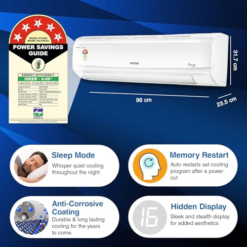About this item Split AC with inverter compressor: Variable speed compressor which adjusts power depending on heat load. Convertible / adjustable with 4 cooling modes through remote control to operate in different tonnages for different cooling needs Capacity: 1.5 Ton, suitable for Medium Sized Rooms (111 to 150 sq. ft.). High Ambient cooling even at 52° Celsius. Energy Rating: 5 Star Best in class energy efficiency. Annual Energy Consumption: 751.28 kWh/year. ISEER Value: 5 Warranty : 1 Year Comprehensive Warranty on the Product, 10 Years on Compressor and 5 Years on PCB. Copper Condenser : The copper condenser ensures superior heat transfer while minimizing maintenance needs. Its rust- and corrosion-resistant properties enhance durability, providing uninterrupted cooling. Key Features: 4 Adjustable Cooling Modes, Digital Temperature Display, Hidden Display, Wide Operating Range 110V -285V voltage range; Noise Level: IDU – 44/43/42/38 (dbA) Special Features: Anti Dust Filter, Antimicrobial Protection, Anti-Corrosive Coating, LED Display, Self Diagnosis, Sleep Mode, Turbo, 4 Step Adjustable Cooling, Memory Restart, Anti-freeze thermostat