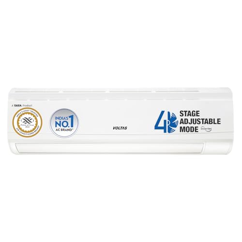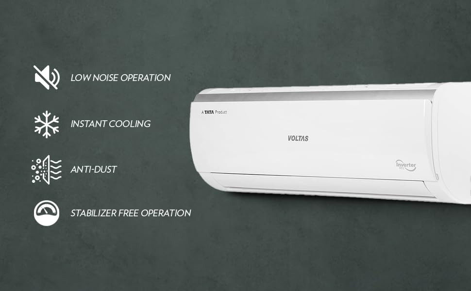 About this item 4-in 1 Adjustable Mode-Saves Power and keeps you Comfortable in Different Conditions by running on 4 different cooling capacities. Turbo Cooling=Quick and Uniform Cooling – Voltas AC delivers higher air flow with its unique louvre design to help cool the room faster with no hot spot in a short period. Anti Dust Filter=The air conditioner features an anti-dust filter that helps to remove dust and other small particles from the air. CO2 Reduction=This helps in reducing the levels of CO2 in a closed room to increase the level of fresh air ventilation. Copper Condenser-The AC is equipped with a copper condenser that provides better cooling and is more durable compared to aluminum condensers. High Ambient Cooling=Extreme Ambient Temperature Controlling Capabilities – The Voltas Adjustable Inverter AC cools even at 52°C. With its superior cooling capacity, it cools easily at high temperatures. Optimal Energy Saving=Featuring optimal energy-saving functionality, this AC is designed to provide you with the ideal balance between comfort and energy efficiency